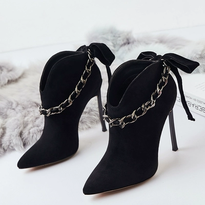2019 mùa đông mới mũi nhọn cao gót gợi cảm nông miệng đen da lộn mỏng cộng với nhung căng ủng trẻ em - Giày ống giày nữ cổ cao