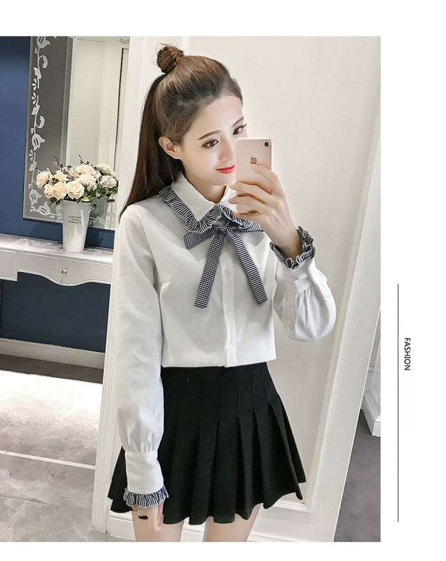 Áo sơ mi nữ nhỏ xinh dễ thương thắt nơ mùa thu và mùa đông mới ngọt ngào ren dài tay áo nhung kẻ sọc sơ mi trắng nữ Áo sơ mi