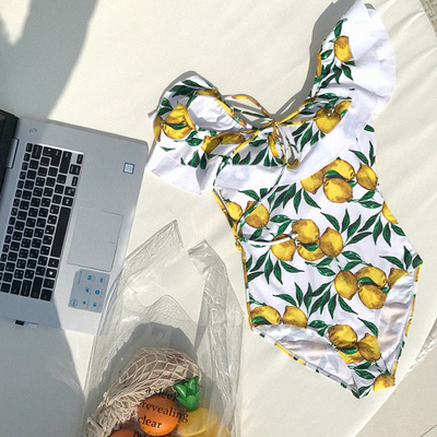 Áo tắm câu cá lớn, cổ áo chữ, lệch vai, xù lông, thép chanh tươi, ngực nhỏ, tam giác mỏng, áo tắm một mảnh, nữ - Bộ đồ bơi One Piece đồ bơi 1 mảnh váy Bộ đồ bơi One Piece