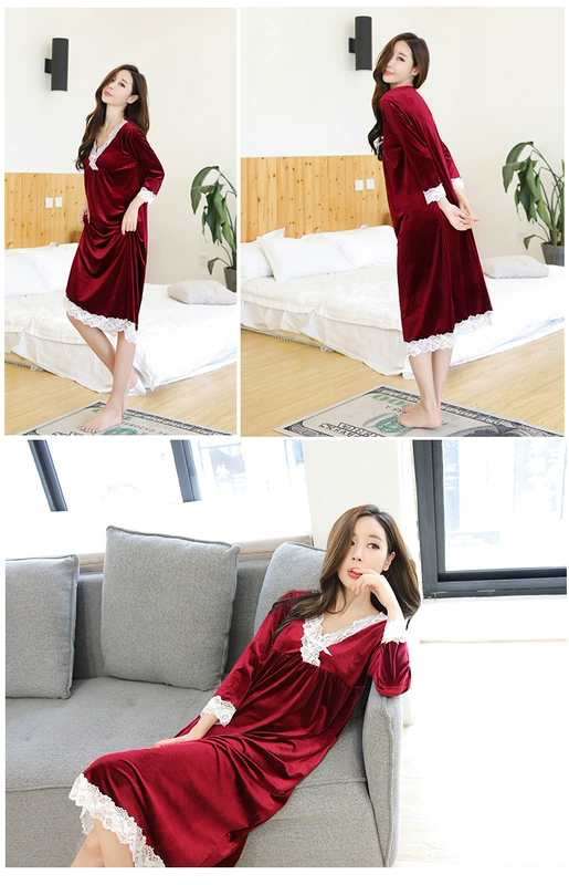 Bộ đồ ngủ bằng nhung vàng của phụ nữ mùa thu và mùa đông váy công chúa gợi cảm gió cung ren dài tay áo ngủ nữ mùa đông dài phần phiên bản Hàn Quốc áo choàng mùa đông
