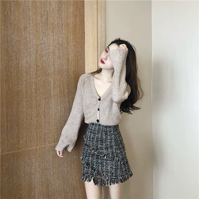 Bộ đồ nữ thần mùa thu 2018 mới tay áo cổ chữ V tay áo len đan len + thắt lưng cao dày một chiếc váy chữ đồ bộ mặc nhà