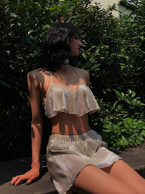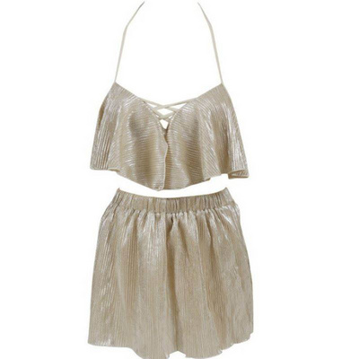 Cao cấp cicory bạc sequin poly chia váy 3 bộ áo tắm mùa xuân nóng bỏng phụ nữ đóng sâu V treo cổ váy che bụng - Bộ đồ bơi hai mảnh áo tắm 2 mảnh yếm Bộ đồ bơi hai mảnh