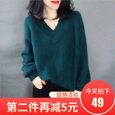 Châu Âu ga 2018 thu đông mặc hàng mới châu Âu khí chất màu xanh thủy triều cổ chữ V áo thun rộng rãi áo len nữ quan ao nu Áo len