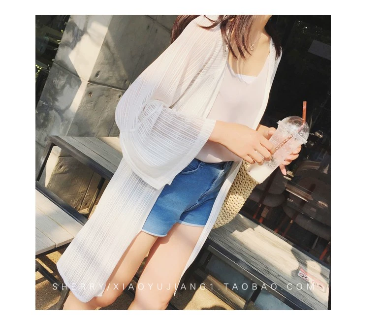 Hàn quốc phiên bản của ren voan cardigan của phụ nữ phần dài áo khoác mỏng dài tay lưới áo sơ mi khăn choàng bãi biển kem chống nắng quần áo bên ngoài mất áo sơ mi loang màu