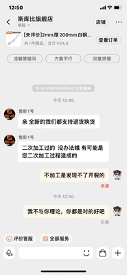 "收到产品棱角不平,只是想打磨平整,黑色刚磨完就发现开裂,商家就因加工后不予售后为由拒绝退换货"