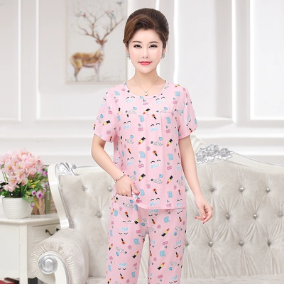 Mẹ tải đồ ngủ bằng lụa cotton mùa hè thoải mái và thoáng khí phục vụ tại nhà kích thước lớn nữ trung niên 40-50 tuổi phụ nữ trung niên - Quần áo của mẹ các kiểu có áo đồ bộ tuổi trung niên Quần áo của mẹ