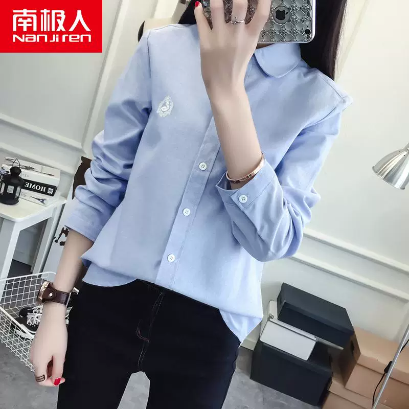 Nam Cực 2018 thu đông mới áo sơ mi thêu bông nhỏ thiên nga phiên bản Hàn Quốc của những chiếc áo sơ mi nữ nhỏ tươi hoang dã áo sơ mi jean nữ tay dài