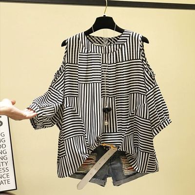 Phiên bản hàn quốc mùa hè cổ tròn quây tay áo sọc bụng voan nữ lỏng lẻo năm điểm đèn lồng tay áo cỡ lớn - Áo sơ mi chiffon ren áo công sở nữ Áo sơ mi chiffon ren