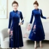 Quần áo thu đông 2018 mới theo phong cách quốc gia đầm nhung vàng size lớn được thêu mỏng dài tay váy xòe rộng phía dưới quần bò ống rộng