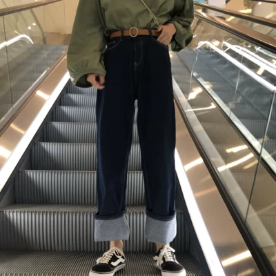 Quần jean nữ mùa xuân và thu 2018 phiên bản mới của Hàn Quốc của Harajuku bf retro giản dị lỏng mỏng thẳng chân rộng quần thủy triều quần dài