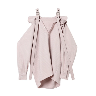 Thiết kế cộng với áo sơ mi nữ đầu thu 2019 Mới vừa dài Hồng quây quai áo sọc - Cộng với kích thước quần áo ao khoac nu Cộng với kích thước quần áo