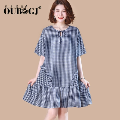 Váy kẻ sọc OUBOGJ cotton dài mùa hè 2019 mới rộng kích thước lớn nữ retro một từ váy - A-Line Váy đầm xòe trễ vai voan A-Line Váy