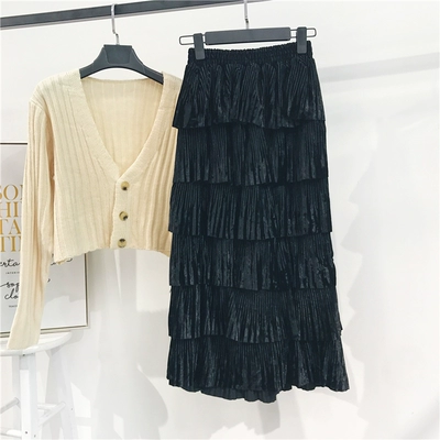 Váy xếp li váy nữ mùa thu lỏng thời trang hoang dã retro cao eo vàng nhung dài Một đoạn váy chữ chân váy công sở chữ a