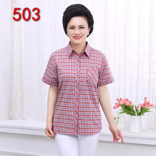 Zhong Hai mẹ mùa hè cotton ngắn tay áo sơ mi nữ trung niên kẻ sọc sơ mi cotton cỡ lớn nửa áo sơ mi tay - Quần áo của mẹ áo sơ mi nữ trung niên Quần áo của mẹ